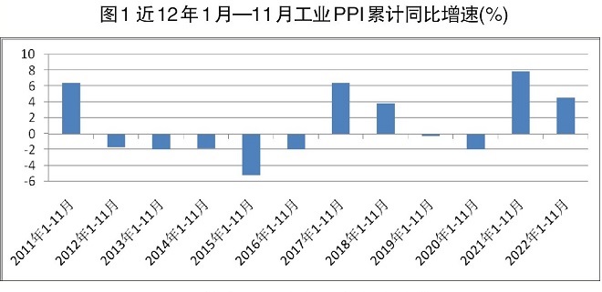 工業PPI累計同比增速基本走勢。2020年1月起,國統局按月發布32個大類工業行業PPI累計同比情況。2022年1月—11月份工業PPI累計同比增長4.5%,在近12年中僅低於2011年、2017年、2021年同期(見圖1)。鑒於2021年1月—11月份工業PPI累計同比增長7.9%,是近12年中的最高值,由此可判定2022年PPI累計同比增速在2021年大幅增長的基礎上,又保持了較高增長。據此推算,2022年1月—11月份工業PPI較2019年同期大幅增長了10.61%,較2020年同期大幅增長了12.86%。據此可判定2022年工業品出廠價格處於曆史較高水平。