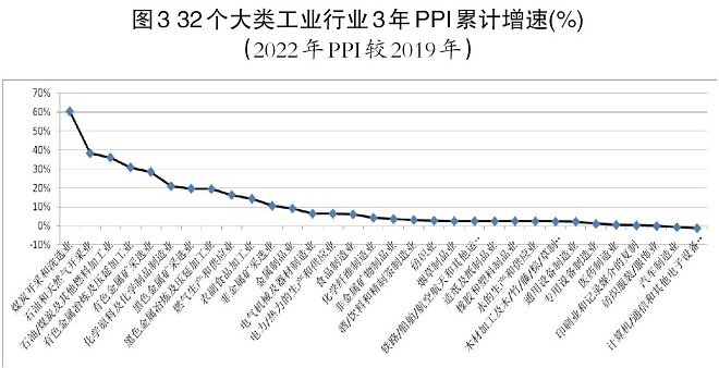 綜上,石油和天然氣開采業、石油/煤炭及其他燃料加工業、化學纖維製造業、化學原料及化學製品製造業、煤炭開采和洗選業5個大類工業行業連續3年成為引導工業PPI漲跌的主要行業。與2019年常態化年份相比,近3年(2020年—2022年)工業經濟中上遊原燃料行業價格上漲幅度較大,但麵向居民消費的工業製造行業PPI上漲幅度有限,從而對CPIxingchengjiaohaodezhicheng,biaomingshangyougongyexingyejiagededafushangzhangbingmeiyouchuandaozhishehuixiaofeixingye,zheyeyiweizheshangyougongyexingyejiageshangzhangbuweixiaofeizhongduansuojieshou。