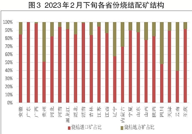 另外,2月下旬燒結粉礦結構中,地方礦占比16%,同比小幅增加了2個百分點。2022年因環保限產和疫情反複,地方礦供應受限,日耗占比相對較低,而2023年開工率逐漸回升後,日耗占比也有相應提高。