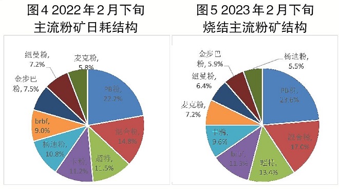 燒結用主流粉礦品種結構。圖4和圖5所示分別為最近兩年同期燒結用主流粉礦的品種結構。由圖可見,PB粉作為中品位主流資源的典型代表,其日耗保持首位,占比在23%左右,變化不大。FMGhunhehechaotefenzuoweidipinweizhuliuziyuan,suirankuangshangeidejiagezhekouyizaixiajiang,xingjiabiyejiaodi,dangangchangyinlirunchixubujiaerduiqibaochijiaoqiangdexuqiu,rihaozhanbirengbaochiqianwei。2023年2月下旬,FMG混合和超特粉占比同比上年都有所擴大,二者合計占比由26.3%提高至30.4%。