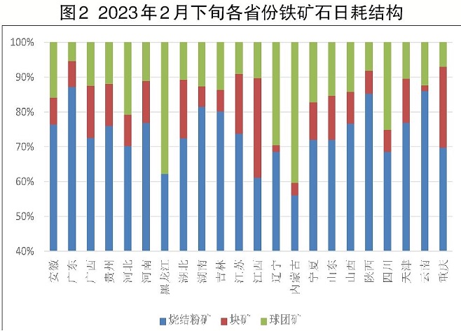 樣本鋼廠所在省份鐵礦石日耗種類結構。圖2所示為2月下旬調研樣本鋼廠所在省份的鐵礦石平均日耗種類結構。由圖可知,第一,燒結粉礦日耗占比相對較大的省份是廣東、雲南和陝西,都在85%以上;占比相對較低的是內蒙古,僅56%;其餘地區都在60%~80%。全國樣本地區平均占比73%。第二,塊礦日耗占比較高的是江西,達到29%;其次是重慶,也達到23%;黑龍江的樣本鋼廠2023年2月下旬未使用塊礦,遼寧和雲南樣本鋼廠塊礦日耗占比也僅為2%。樣本鋼廠塊礦日耗平均占比11%。第三,球團礦日耗占比較高的是內蒙古和黑龍江,分別達到40%和38%;占比較低的是廣東,僅占5%。球團礦日耗平均占比16%。