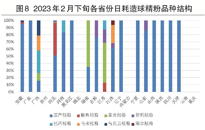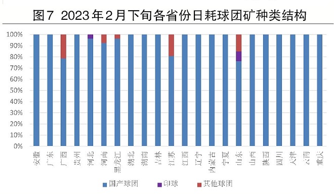 各省份日耗球團礦品種結構。圖7所示為2023年2月下旬樣本鋼廠所在省份的日耗球團礦的種類結構。由此可見,山東、江蘇和廣西樣本鋼廠的本地球團占比相對較低,為80%左右。同時,全國隻有山東與河北樣本鋼廠使用了印度球團,占比分別為9.1%和3.6%。其他地區所用球團礦幾乎都為國產球團礦。