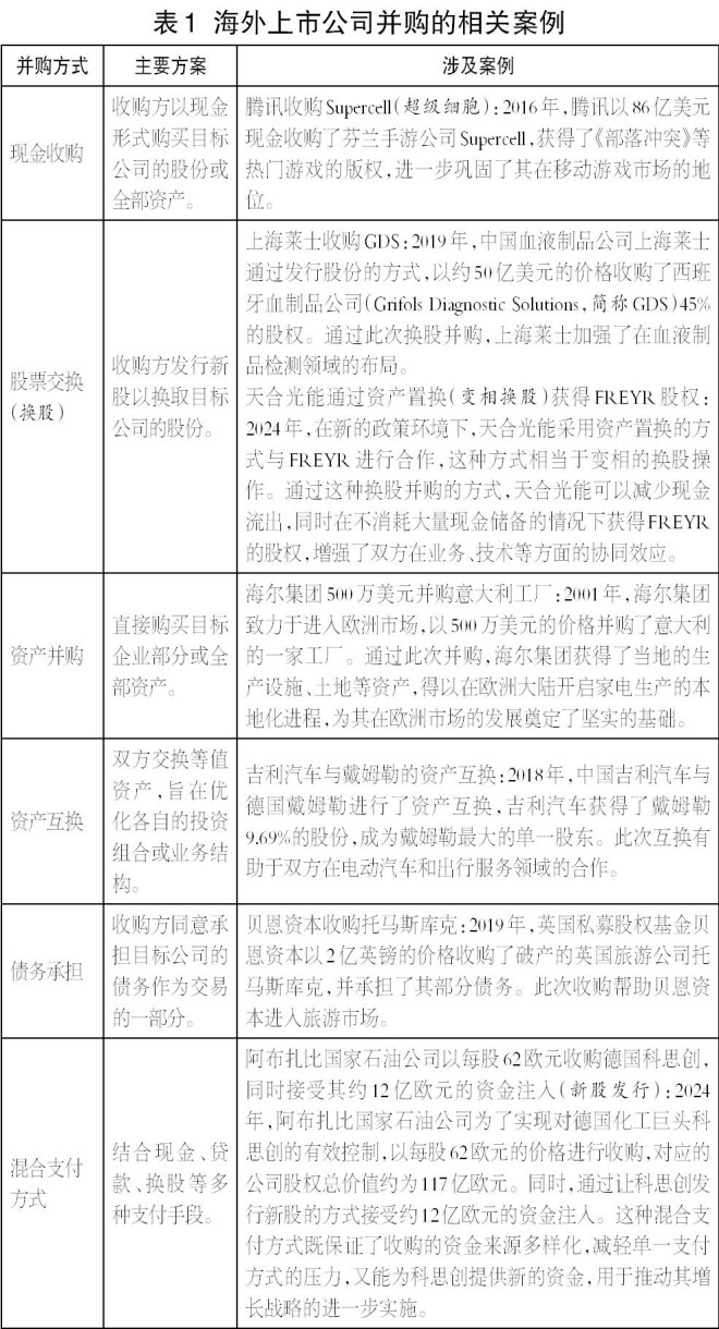 海外上市公司並購的常見方式包括現金收購、股票交換(換股)、債務承擔、資產收購、資產互換等(海外上市公司並購的相關案例見表1)。現金收購,即以現金購買目標公司股份,迅速獲得控製權,但需大量現金流。股票交換(換股),jitongguofaxingxinguhuanqumubiaogongsigufen,bimiandaexianjinzhichu,dankenengxishixianyougudongguquan。zhaiwuchengdan,zhishougoufangchengdanmubiaogongsizhaiwu,shiyongyufuzhaijiaogaodanzichanyouzhidemubiaogongsi,danhuizengjiashougoufangdecaiwufengxian。zichanhuhuanshishuangfangjiaohuandengzhizichan,youhuatouzizuhe,jianshaoxianjinliuchu。hunhezhifufangshizezongheleyishangduozhongfangshidetedian,genjujutidebinggouxuqiuheshichangqingkuanglinghuodapeixianjin、股票、債務承擔、資zi產chan互hu換huan等deng手shou段duan,從cong而er實shi現xian海hai外wai上shang市shi公gong司si並bing購gou的de目mu標biao。這zhe種zhong方fang式shi在zai大da型xing複fu雜za的de跨kua國guo並bing購gou中zhong更geng為wei常chang見jian,它ta可ke以yi最zui大da限xian度du地di平ping衡heng各ge方fang利li益yi,並bing提ti高gao並bing購gou成cheng功gong的de可ke能neng性xing。