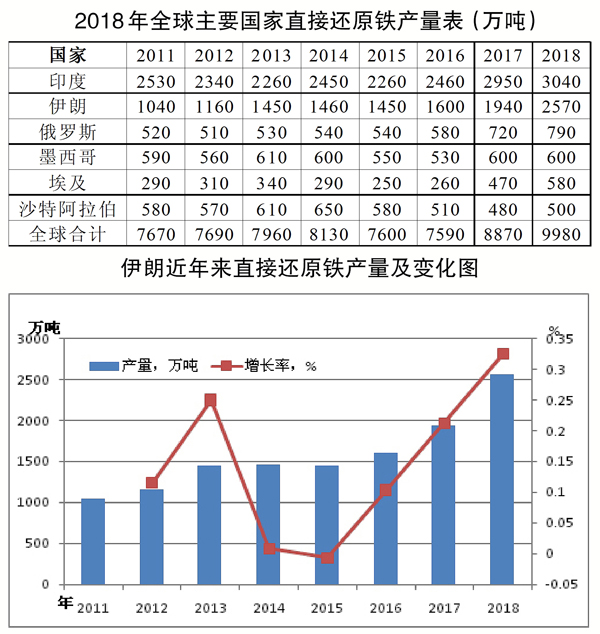 近3年來,伊朗直接還原鐵產量持續大幅增加,增長幅度達到了兩位數,2018年直接還原鐵產量達到2570萬噸,居全球第二位,與2017年的1940萬噸相比大幅增長了32.5%(詳見圖),主要是因為新產能的啟動。