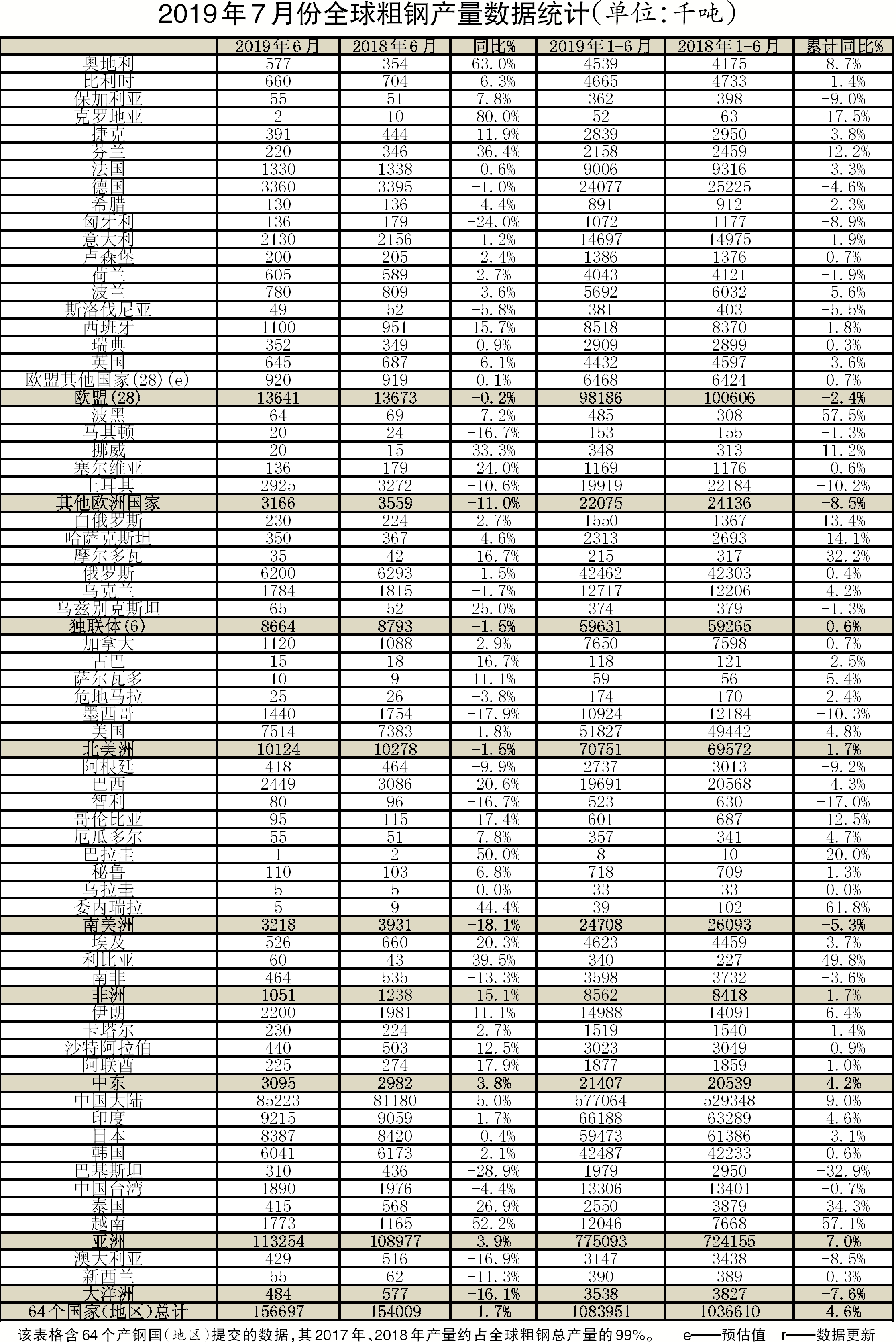 本報訊(記者朱曉波)8月27日,世界鋼鐵協會(WSA)發布了7月份全球粗鋼產量數據。7月份,全球64個納入世界鋼協統計的國家和地區粗鋼產量為1.57億噸,同比增長1.7%。
