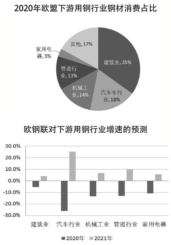 對於鋼鐵行業最大的消費領域,同時也是歐盟今年受疫情影響最小的行業——建築行業來說,預計今年鋼材消費量將占歐盟鋼材消費市場的35%。歐鋼聯預測,建築行業產量將在2020年同比下降5.3%,在2021年回升4%。