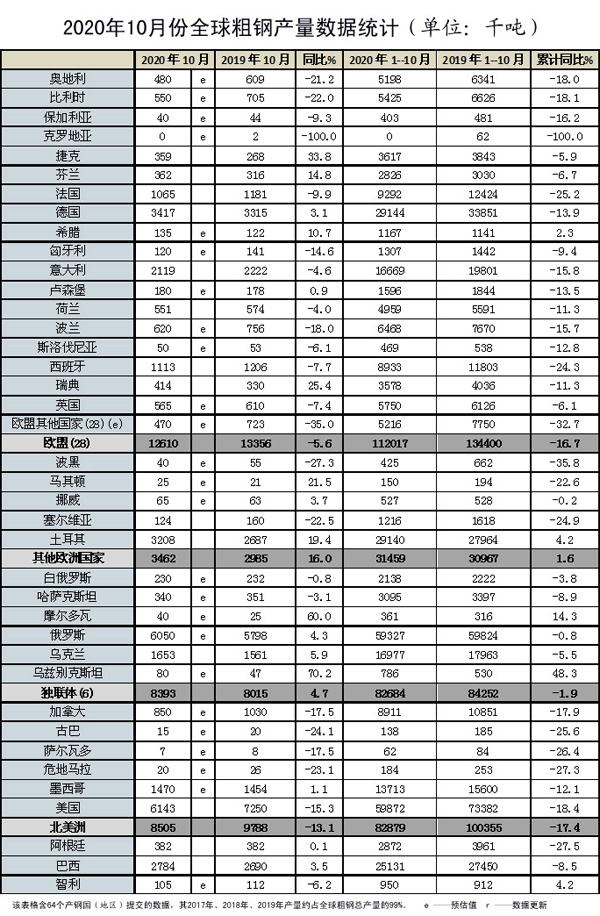 10月份全球粗鋼產量同比增長7.0%