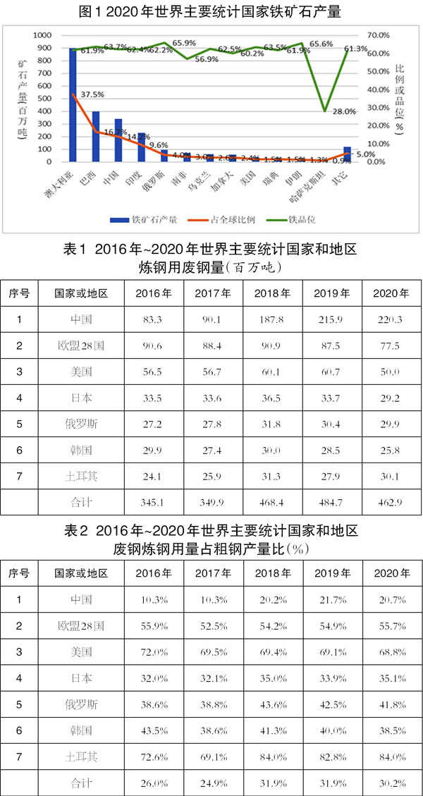 從國際回收局的統計資料可以看出:一是在統計的7大主要國家和地區,2020年煉鋼用廢鋼量為4.6億噸,占粗鋼產量的30.2%。二是中國是世界第一大廢鋼利用國,2020年煉鋼用廢鋼量為2.2億噸,占7大主要國家和地區煉鋼用廢鋼總量的47.6%。但是,中國廢鋼利用量隻占同年本國粗鋼產量的20.7%,低於歐美發達國家的占比。三是土耳其是世界廢鋼煉鋼用量占比最高的國家,2018年以來比例一直高於80%。然而,土耳其本國回收的廢鋼資源有限,主要靠進口,是世界第一大廢鋼資源進口國。2020年,土耳其進口廢鋼2243.5萬噸,占當年廢鋼煉鋼用量的74.6%。四是近5年來美國廢鋼煉鋼用量占比在70%上下徘徊,2017年更是成為世界廢鋼煉鋼用量占粗鋼產量比例最高的國家。近5年來,歐盟28國的廢鋼煉鋼用量占比在55%左右。這說明完成工業化的國家在煉鋼過程中利用的廢鋼更多。五是日本的廢鋼煉鋼用量占比為32%~35.1%,並基本呈現逐年遞增的趨勢。