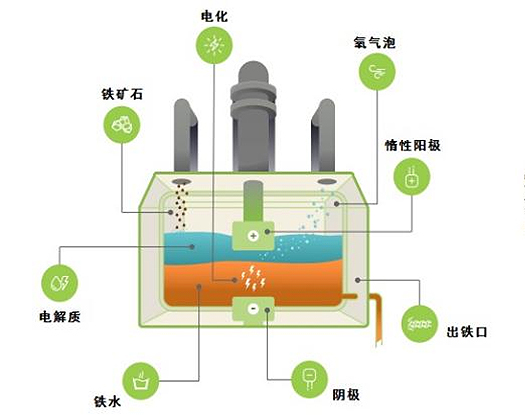 熔融鐵礦石電解煉鐵技術中的電解工藝圖例。 (圖片來源於波士頓金屬公司官網)