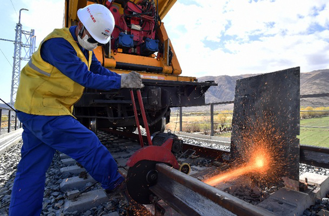 中鐵十一局工人在川藏鐵路拉薩至林芝段進行長鋼軌無縫焊接作業。記者 覺果 攝