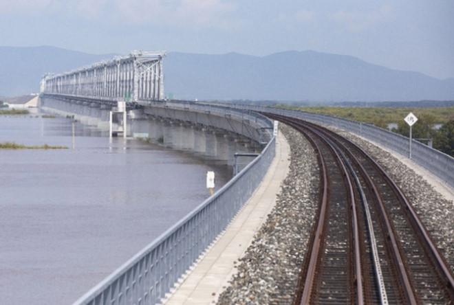 同江中俄黑龍江鐵路大橋位於中國黑龍江省同江市與俄羅斯下列寧斯闊耶市之間,橋梁全長約7194米,主橋長約2215米,其中中方境內主橋長約1886米,設計運營時速100公裏、年過貨能力2100萬噸。