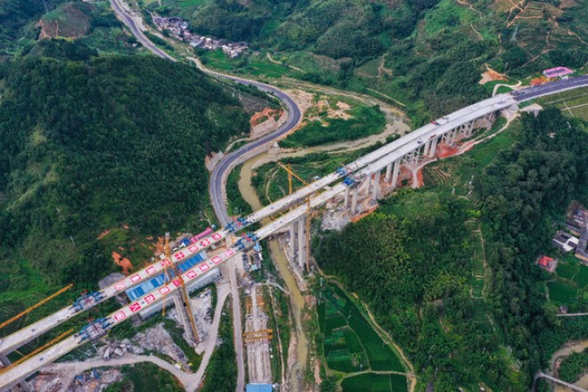 建設中的書洋特大橋(8月23日攝,無人機照片)。 8月24日,由中鐵十六局集團承建漳(州)武(平)高速公路重難點及控製性工程——書洋特大橋主橋順利合龍,該橋是全線首座合龍的大跨度橋梁。書洋特大橋采用雙向四車道高速公路標準,設計時速100公裏,全長1074米,主墩高86米。 新華社發(許鵬健 攝)