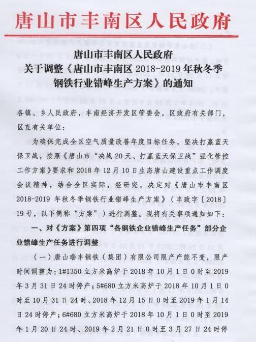 (一)唐山瑞豐鋼鐵(集團)有限公司限產產能不變,限產時間調整;