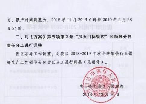 17日唐山市豐南區政府出台相關文件,對《唐山市豐南區2018-2019年秋冬季鋼鐵行業錯峰生產方案》中第四項“各鋼鐵企業錯峰生產任務”部分企業錯峰生產任務進行調整,其中