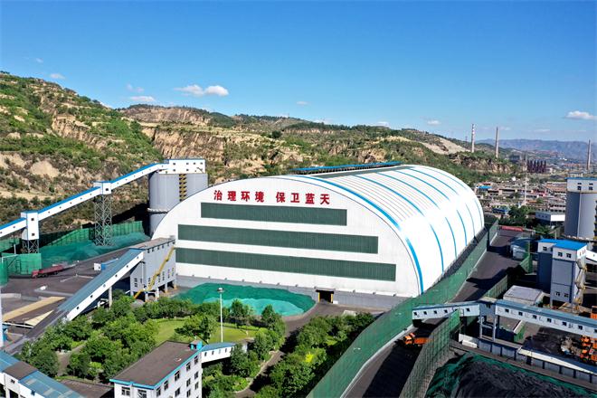 洗煤生產現場,白藍相間、長 249 米、跨度 120 米、高 52 米、占地麵積為 27000平方米的煤場大棚,高44.5米、直徑26米、儲存量達1.4萬噸的兩座精煤筒倉,巍然矗立在那裏。