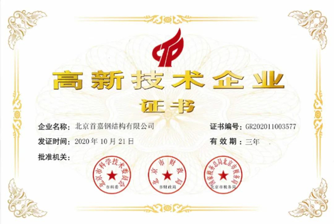 近日,首鋼城運公司旗下北京首嘉鋼結構有限公司收到由北京市科學技術委員會、北京市財政局、國家稅務總局北京市稅務局聯合頒發的《高新技術企業證書》,成功獲得“國家高新技術企業”認定。