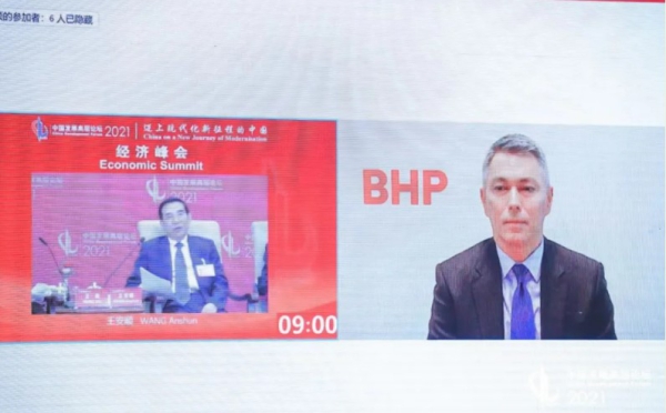 3月20日,以“邁上現代化新征程的中國”為主題的中國發展高層論壇2021年會在北京成功召開。必和必拓(BHP)首席執行官韓慕睿(Mike Henry)受邀在線參加經濟峰會“新技術革命與城市化”主題分論壇。國務院發展研究中心副主任王安順、國務院發展研究中心市場經濟研究所所長王微、國務院發展研究中心市場經濟研究所副所長鄧鬱鬆、中美綠色基金董事長徐林、麥肯錫公司全球資深董事華強森、中國科學院科技戰略谘詢研究院院長潘教峰也出席了該分組討論。