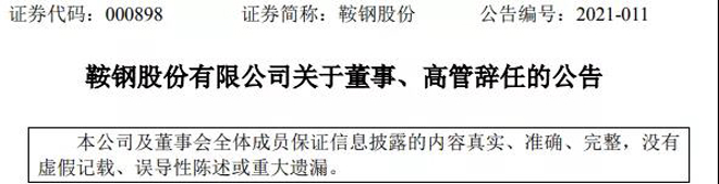鞍鋼股份馬連勇、劉傑兩位副總辭職