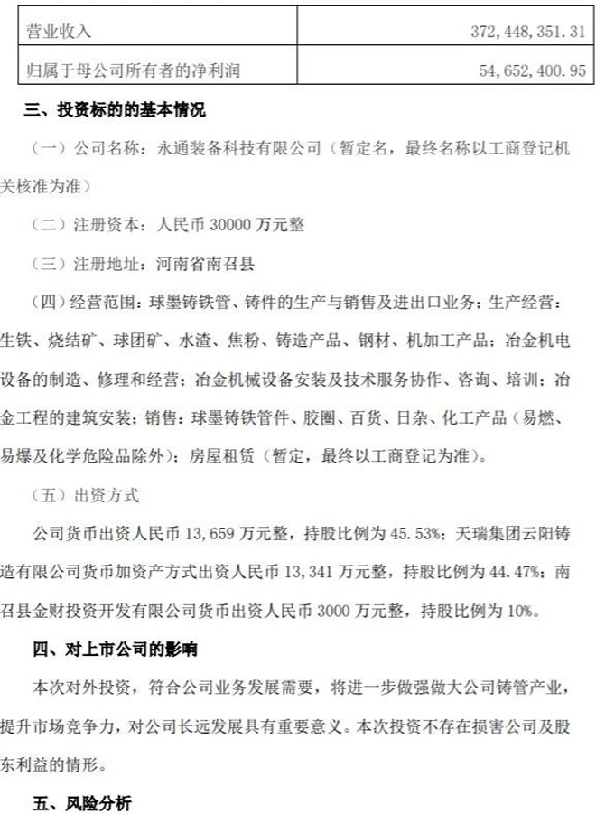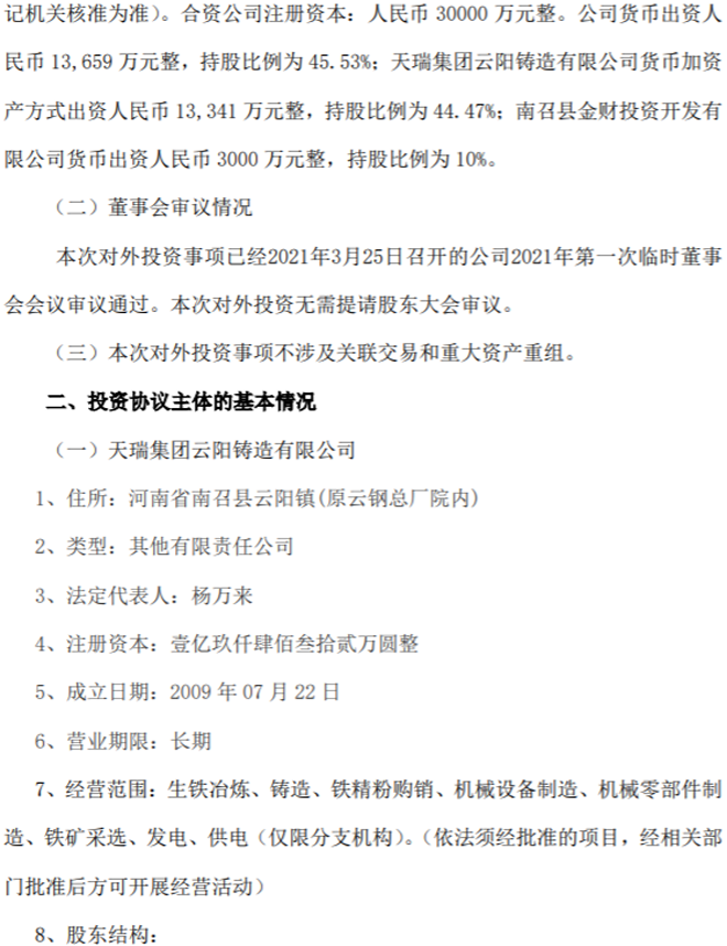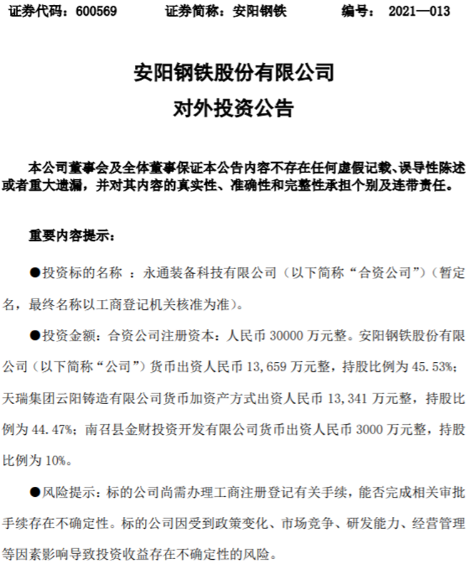3月26日,安陽鋼鐵發布公告稱,該公司擬與天瑞集團雲陽鑄造有限公司、南召縣金財投資開發有限公司合作,在河南省南召縣設立合資公司——永通裝備科技有限公司。合資公司注冊資本3億元。安陽鋼鐵貨幣出資1.37億元,持股比例45.53%。公告表示,此次對外投資,將進一步做強做大安陽鋼鐵鑄管產業。