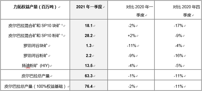 力li拓tuo在zai報bao告gao中zhong解jie釋shi了le一yi季ji度du產chan銷xiao量liang均jun下xia降jiang的de原yuan因yin,主zhu要yao原yuan因yin是shi二er月yue礦kuang區qu的de降jiang雨yu天tian數shu高gao於yu平ping均jun水shui平ping,以yi及ji固gu定ding設she備bei的de穩wen定ding性xing受shou到dao影ying響xiang。勞lao動dong力li不bu足zu和he惡e劣lie天tian氣qi導dao致zhi了le維wei護hu工gong作zuo的de中zhong斷duan。熱re帶dai氣qi旋xuan瑟se羅luo雅ya(Seroja)在4月影響了礦山和港口的作業。