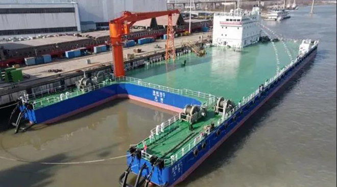首鋼京唐供貨的國內首艘多功能海上風電工藝駁船正式交付使用