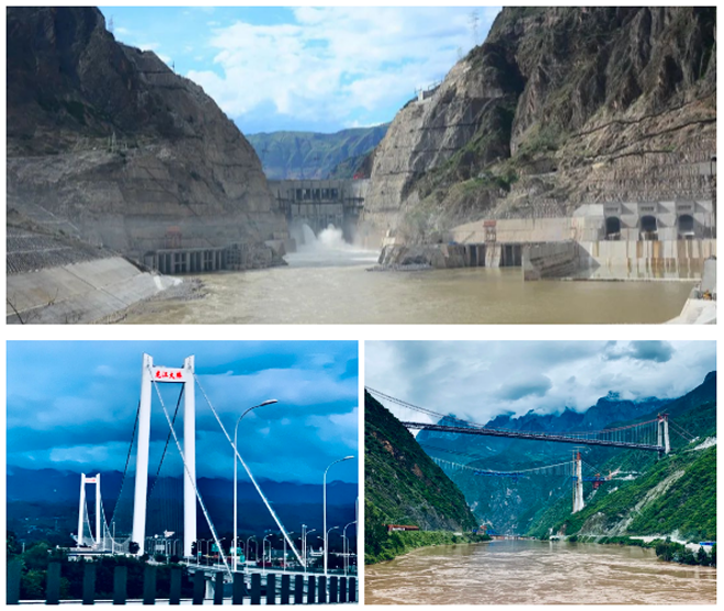 上、左下、右下圖依次為昆鋼產品應用在烏東德水電站、龍江特大橋、虎跳峽金沙江特大橋上。