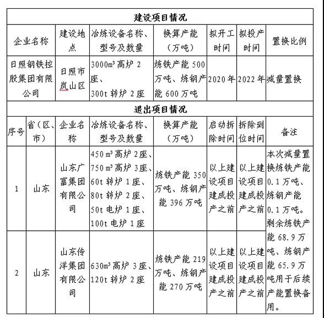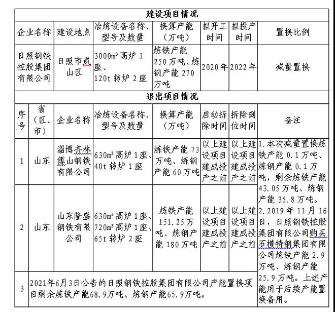 6月3日,山東省工業和信息化廳將日照鋼鐵控股集團有限公司(簡稱“日照鋼鐵”)產能置換方案進行了公示,據悉,日照鋼鐵擬減量置換新建3000m³高爐3座。詳情如下表: