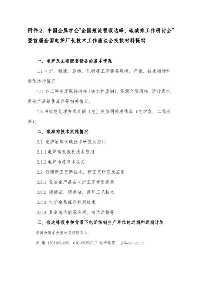 擬參會的單位,回執必須加蓋公章,必須提交交換資料,並於7月25日前返回交換資料至中國金屬學會接收材料聯係人:薑 曦 13811891085 ; 交換材料提綱見附件2. 中國金屬學會“全國短流程碳達峰、碳減排工作研討會”暨首屆全國電爐廠長技術工作座談會交換材料提綱。