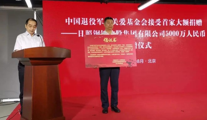 8月6日上午,退役軍人事務部舉行接受捐贈儀式,日照鋼鐵控股集團有限公司向中國退役軍人關愛基金會捐贈5000萬元人民幣。退役軍人事務部黨組書記、部長孫紹騁出席並向捐贈企業頒發捐贈證書。全國政協常委、經濟委員會副主任、武警部隊原上將政治委員、中國退役軍人關愛基金會名譽理事長孫思敬出席。退役軍人事務部黨組成員、副部長馬飛雄主持儀式。京華創新集團總裁薛健、副總裁王立飛見證捐贈儀式。