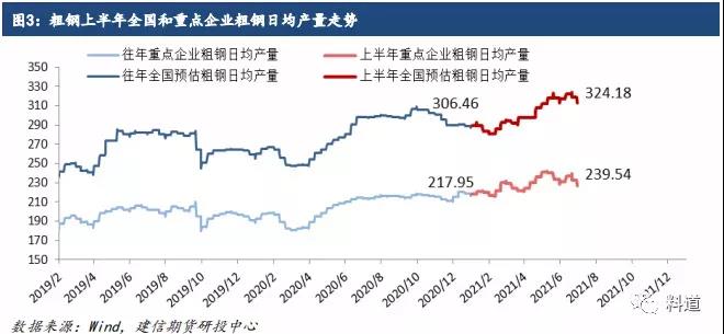 圖3數據顯示,今年上半年粗鋼日均產量普遍高於去年同期值,日均產量最高達324.18萬噸較去年最高306.46萬噸增加17.72萬噸。