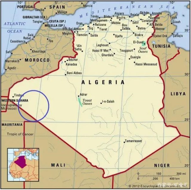 加拉·傑比萊特鐵礦(Gara Djebilet)位於阿爾及利亞西部廷杜夫省,鐵礦儲量約為35億噸,含鐵品位較高,達到57%,屬於露天礦,但該礦礦石結構較複雜,含磷量高,需采用適當的方法處理,將磷含量從0.8%降到0.3%。初步估計,該礦開發成本約20億美元,約120億元人民幣。