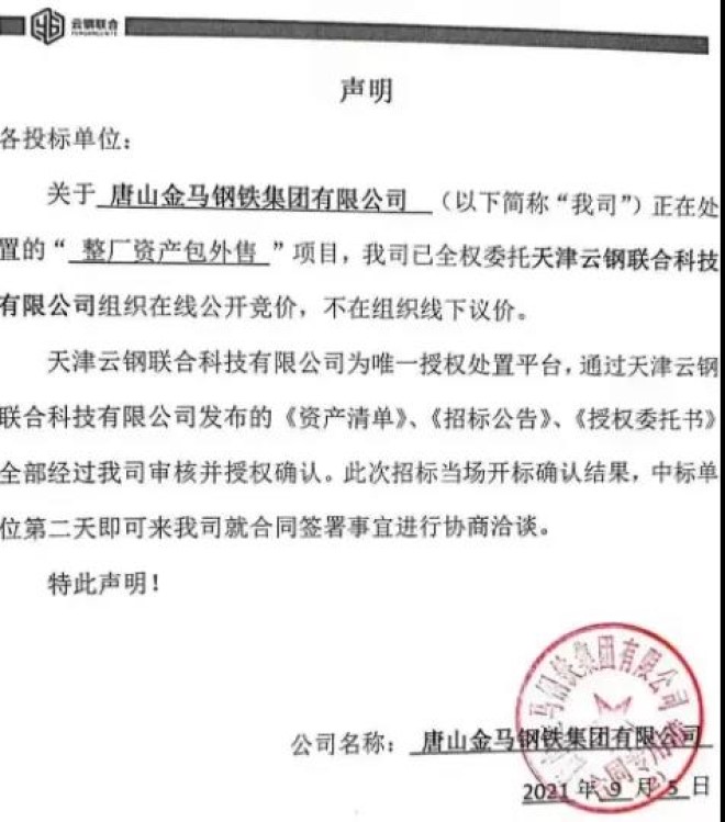 9月5日,唐山金馬鋼鐵集團有限公司發布聲明稱該公司的“整廠資產外售”項目已全權委托天津雲鋼聯合科技有限公司組織在線公開競價。共包括轉爐2座;高爐2座;燒結2座;豎爐1座;白灰窯1座;軋鋼鋼結構廠房及附屬設備;發電廠3座;製氧4座;12萬㎡原料棚1座;煤氣櫃2座;各類車輛83輛等。其具體範圍最終以看貨前劃定的範圍為準。