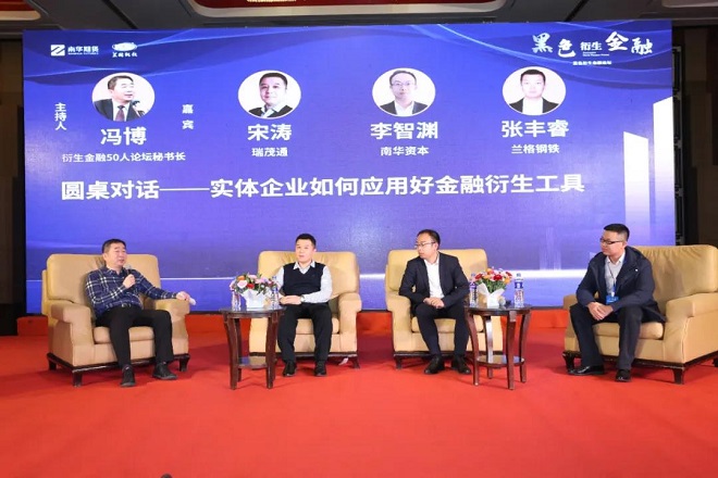 此外,會上還舉行了圓桌論壇,由衍生金融50人論壇秘書長馮博主持,南華資本副總經理李智淵、瑞茂通供應鏈管理股份有限公司期權策略總監宋濤、蘭格鋼鐵網高級分析師張豐睿等嘉賓們就實體企業如何應用好金融衍生工具進行了深入探討。