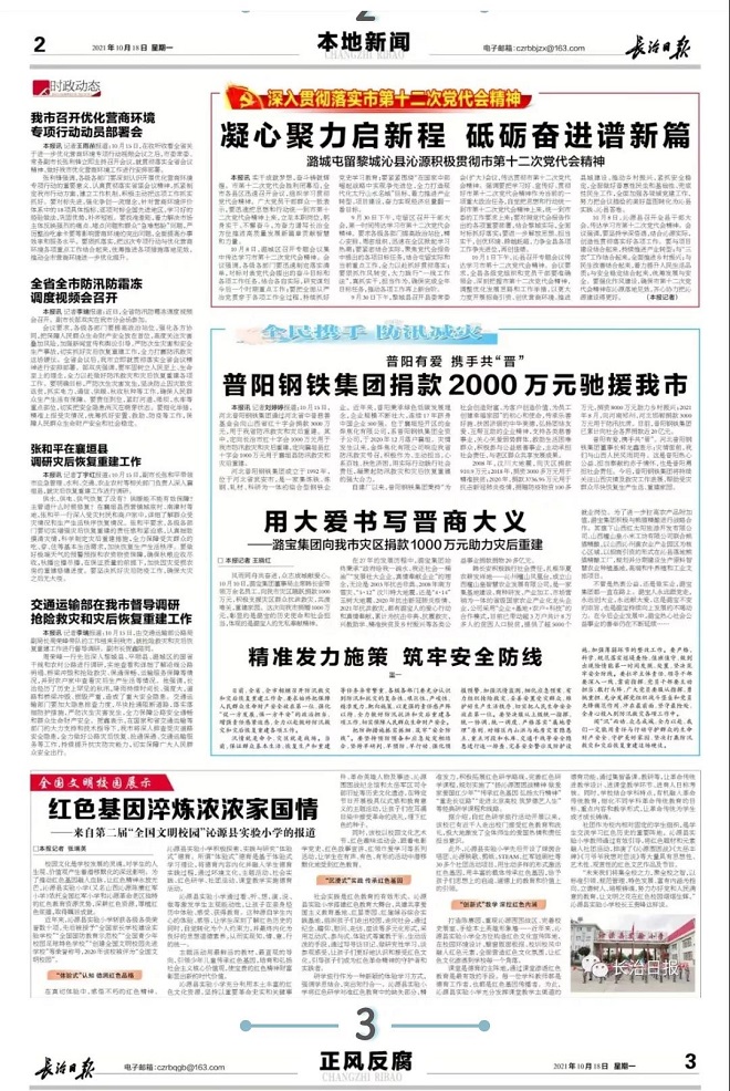 山西多家主流媒體報道指出:河北普陽鋼鐵集團從創立到現在,已累計向社會各界捐款近20億元。在踐行高質量發展的同時,大力弘揚中華民族“一方有難、八方支援”優秀傳統美德和“人道、博愛、奉獻”紅(hong)十(shi)字(zi)精(jing)神(shen),及(ji)時(shi)向(xiang)遭(zao)受(shou)洪(hong)澇(lao)災(zai)害(hai)的(de)群(qun)眾(zhong)伸(shen)出(chu)援(yuan)助(zhu)之(zhi)手(shou),是(shi)積(ji)極(ji)響(xiang)應(ying)國(guo)家(jia)關(guan)於(yu)防(fang)汛(xun)救(jiu)災(zai)工(gong)作(zuo)部(bu)署(shu)的(de)重(zhong)要(yao)舉(ju)措(cuo),充(chong)分(fen)體(ti)現(xian)了(le)普(pu)陽(yang)參(can)與(yu)公(gong)益(yi)事(shi)業(ye)、履行社會責任的擔當精神,為山西省全力打贏防汛減災這場硬仗貢獻了重要力量!
