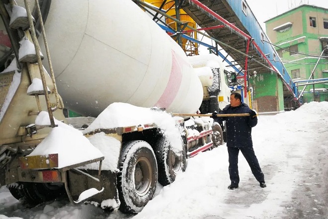 鞍山鋼鐵耐火材料公司夜班職工交班後,與白班同誌一同清理廠區積雪,排查安全隱患,做好鞍山鋼鐵冶金石灰熔劑保產保供工作。