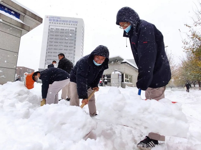 鞍鋼集團鋼鐵研究院青年職工搶先到達單位,為科研人員清掃出道路,保證人員順利通行。