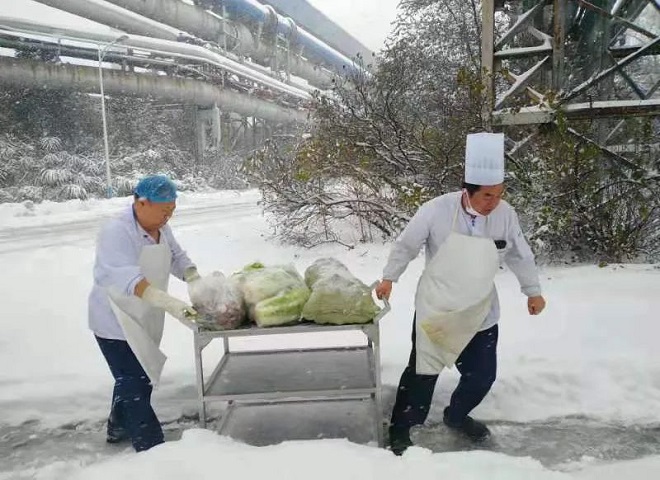 鞍鋼眾元產業現代城服公司在清掃積雪的同時,積極準備食品原料,保障職工就餐需求。