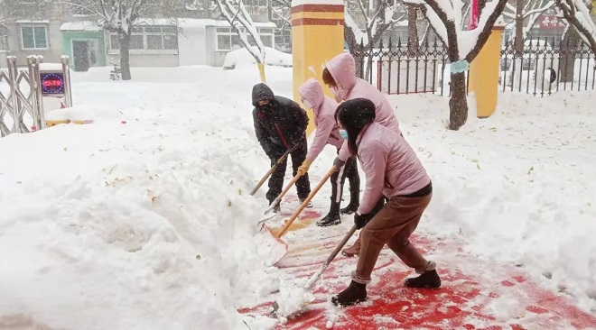 根據鞍山市教育局《關於應對極端天氣變化的緊急通知》精神,全市學校和幼兒園停課一天,鞍鋼眾元產業幼教中心機關及各幼兒園員工仍徒步來到各自單位值守,對積雪及時進行清理。