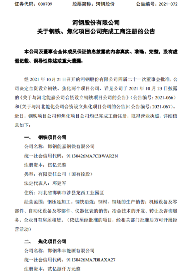 由公告可知:經2021年10月21日召開的河鋼股份有限公司四屆二十一次董事會批準,河鋼股份有限公司決定合資設立鋼鐵、焦化兩個項目公司,詳見該公司於2021年10月23日披露的《關於與河北能嘉公司合資設立鋼鐵項目公司的公告》(公告編號:2021-066)和《關於與河北能化公司合資設立焦化項目公司的公告》(公告編號:2021-067)。