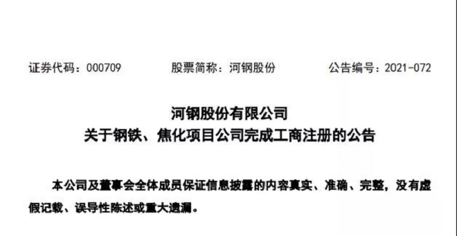 11月10日,河鋼股份發布了《關於鋼鐵、焦化項目公司完成工商注冊的公告》。