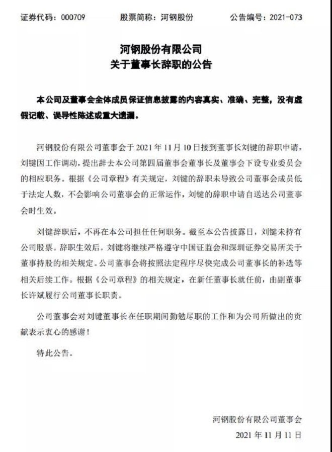 公告中提到:河鋼股份有限公司董事會於2021年11月10日接到董事長劉鍵的辭職申請,劉鍵因工作調動,提出辭去該公司第四屆董事會董事長及董事會下設專業委員會的相應職務。劉鍵的辭職申請自送達該公司董事會時生效,且劉鍵辭職後,不再在該公司擔任任何職務。