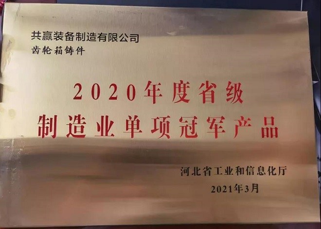 2020年,共贏裝備榮獲省級製造業“單項冠軍”產品稱號,省級製造業“單項冠軍”代表著細分行業最高的發展水平、最強的市場實力,是製造企業的第一方陣、“河北製造”的排頭兵。