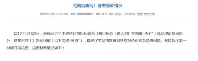 據安徽應急管理廳網消息:2021年10月28日,央視經濟半小時欄目播出標題為《觸目驚心!偌大鋼廠存隱形“殺手”!總經理卻移民國外,常年不在!》新聞報道(以下簡稱“報道”),曝光了蕪湖市富鑫鋼鐵有限公司相關隱患問題。省應急廳第一時間開展核查,核查整改情況如下: