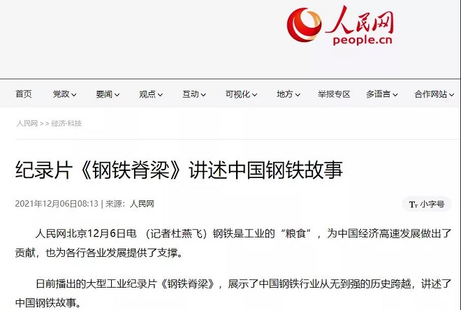 人民網:紀錄片《鋼鐵脊梁》講述中國鋼鐵故事