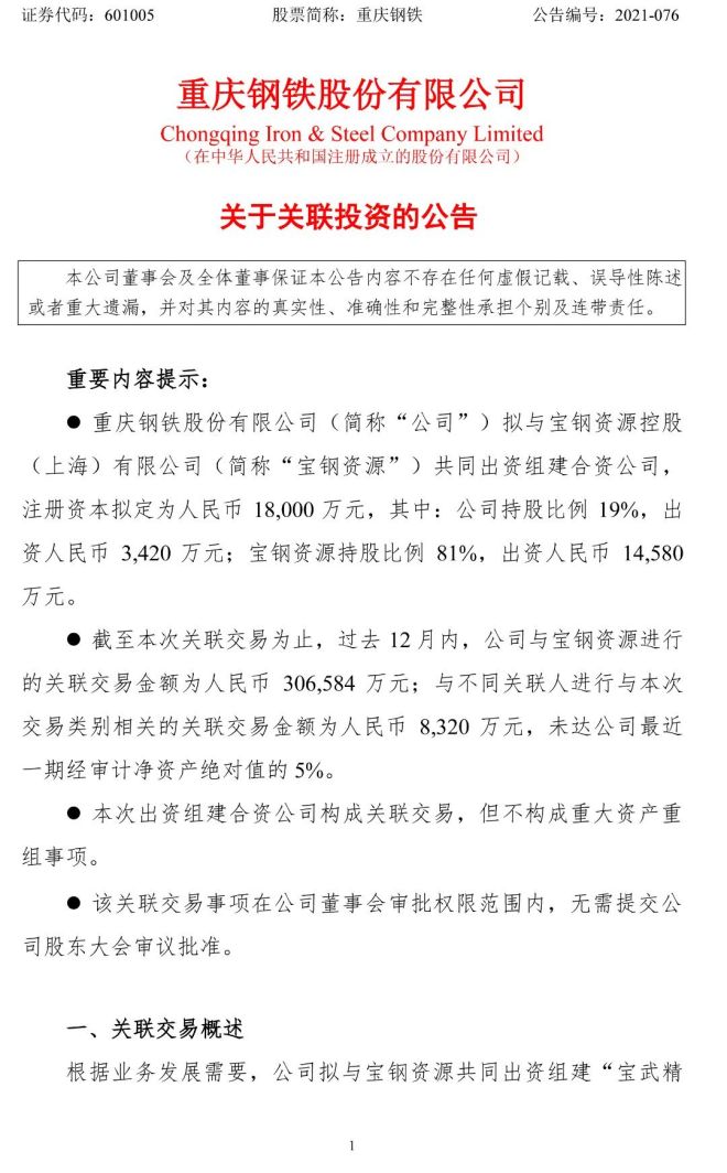 12月22日,重慶鋼鐵股份有限公司發布了《重慶鋼鐵股份有限公司關於關聯投資的公告》(以下簡稱《公告》)。