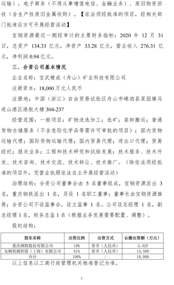 《公告》稱,重慶鋼鐵股份有限公司(簡稱“公司”)擬與寶鋼資源共同出資組建“寶武精成(舟山)礦業科技有限公司”(簡稱“合資公司”),注冊資本擬定為人民幣 18,000 萬元。股東雙方均以貨幣方式出資,其中:公司持股比例 19%,出資人民幣 3,420 萬元;寶鋼資源持股比例 81%,出資人民幣 14,580 萬元。合資公司成立後,將在馬跡山開展鐵礦石混勻加工業務。
