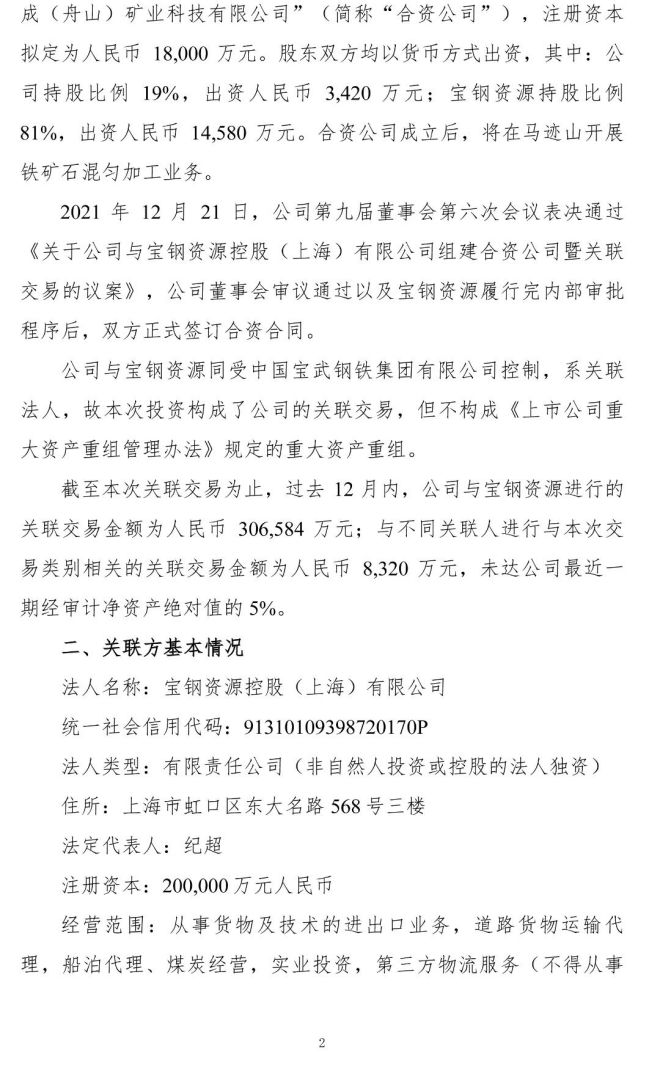 2021 年 12 月 21 日,公司第九屆董事會第六次會議表決通過《關於公司與寶鋼資源控股(上海)有限公司組建合資公司暨關聯交易的議案》,公司董事會審議通過以及寶鋼資源履行完內部審批程序後,雙方正式簽訂合資合同。