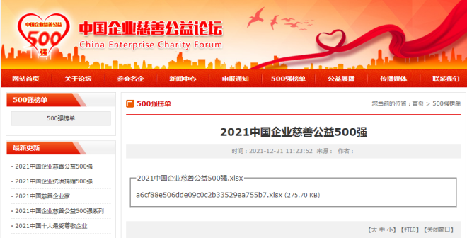 近日,2021中國企業慈善公益500強發布暨第五屆中國企業慈善公益論壇,與第四屆中國重慶·涪陵榨菜產業國際博覽近日在重慶市涪陵區聯袂舉行,重磅發布了2021中國企業慈善公益500強係列榜單。