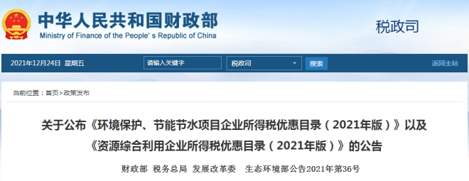 為培育壯大節能環保產業,推動資源節約高效利用,現發布《環境保護、節能節水項目企業所得稅優惠目錄(2021年版)》和《資源綜合利用企業所得稅優惠目錄(2021年版)》,有關事項公告如下:
