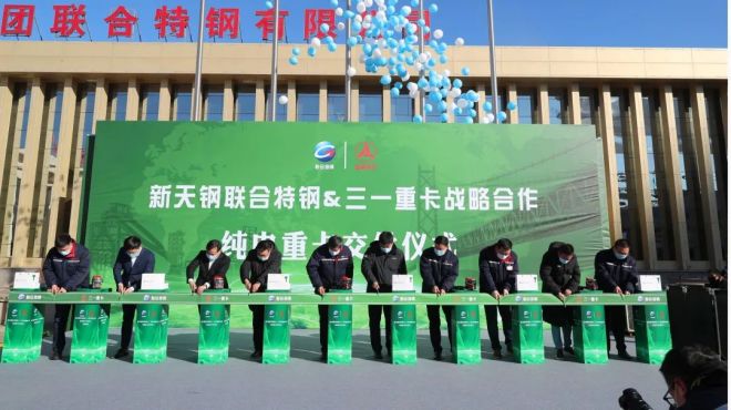 12月26日上午,新天鋼集團聯合特鋼公司和三一重卡戰略合作暨純電重卡交付儀式隆重舉行,30輛江山版純電重卡正式交付使用。